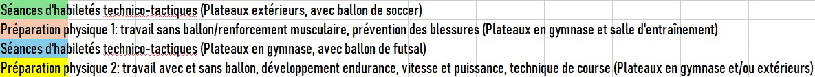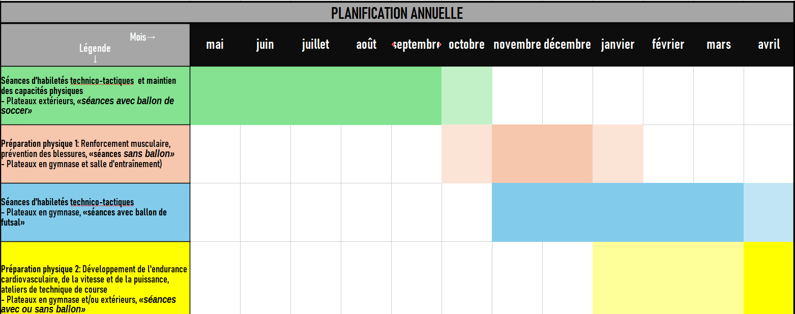 Note: Les espaces de couleur qui sont plus pâles signifient une période de transition de bloc. Ils indiquent donc que la date de début/fin des séances pour le bloc n’est pas fixe. Cela peut varier en fonction de la température, des plateaux disponibles, etc.